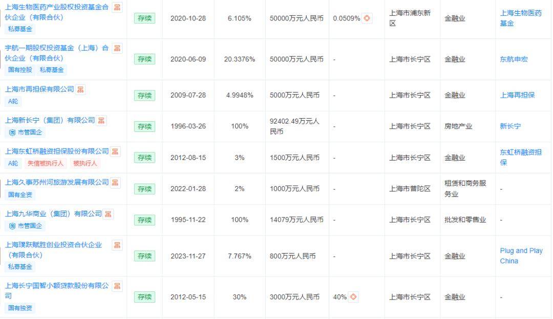 从投资的金融机构看,长宁国资在基金、小贷、担保等领域均有布局,包括上海生物医药产业股权投资基金合伙企业(有限合伙)、宇航一期股权投资基金(上海)合伙企业(有限合伙)、上海东虹桥融资担保、上海长宁国智股份有限公司、上海科创母基金三期等都有其参股的身影。