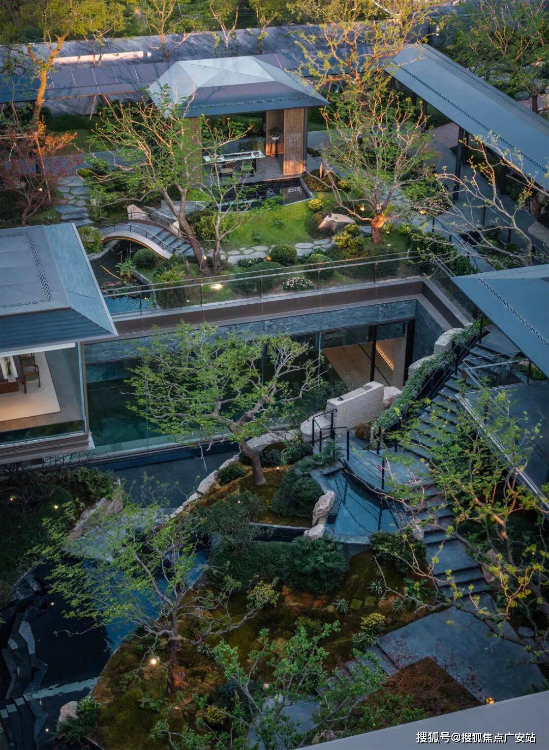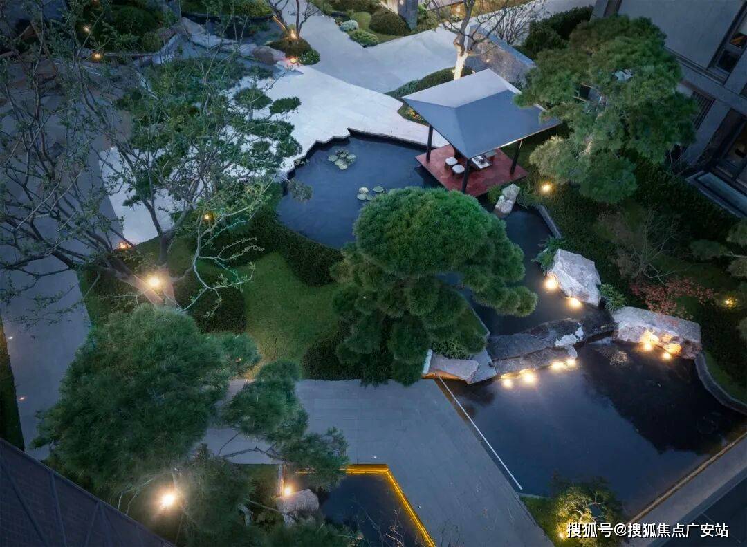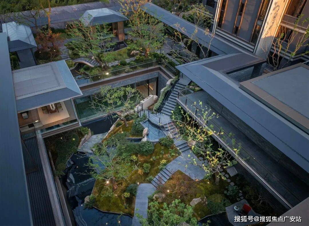 。园林景观借鉴上海豫园与苏州园林造园精髓,打造一轴、三园、多巷景观体系,包括下沉庭院、叠瀑、溪水、小桥等景观节点,营造移步异景,逸趣游园的古典园林意境