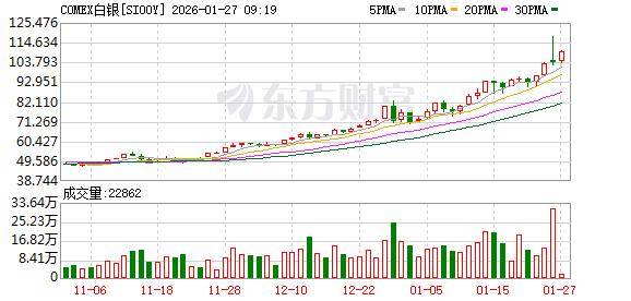 1月26日,白银价格仍在走高,现货、期货一度双双站上110美元/盎司。截至发稿,COMEX白银报109.505美元/盎司,涨幅超8%;伦敦银报109.057美元/盎司,涨幅超5.5%。返回搜狐,查看更多
