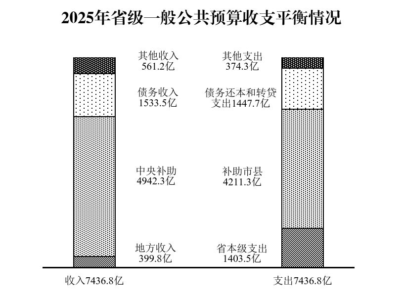 省级一般公共预算地方收入完成399.8亿元,为预算的102.5%;中央补助4942.3亿元,市县上解275.8亿元,一般债务收入1533.5亿元,动用预算稳定调节基金67亿元,调入资金36.7亿元,上年结转181.7亿元,收入合计7436.8亿元。省本级一般公共预算支出1403.5亿元,上解中央63.9亿元,补助市县4211.3亿元,一般债务还本440.3亿元,转贷市县一般债务1007.4亿元,补充预算稳定调节基金75亿元,调出资金55亿元,结转下年180.4亿元,支出合计7436.8亿元。