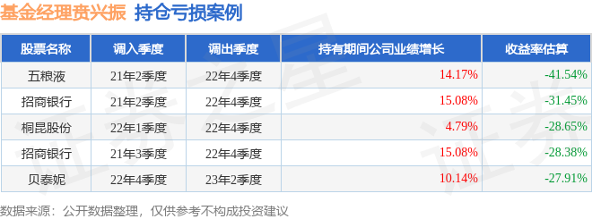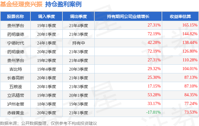 重仓股调仓示例详解: 1、贵州茅台(600519)翻倍案例: 贲兴振管理的银华混改红利灵活配置混合发起式A基金在19年1季度买入贵州茅台,在持有2年又3个季度后在21年4季度卖出。持有期间的估算收益率为165.15%,持有期间贵州茅台在2019年到2021年的年报归属净利润增幅达27.31%。 2、长春高新(000661)调仓案例: 贲兴振管理的银华优质增长混合基金在20年1季度买入长春高新,在持有1年又0个季度后在21年1季度卖出。持有期间的估算收益率为87.13%,持有期间长春高新在2020年到2021年的年报营业总收入增幅达25.3%。 3、五粮液(000858)调仓案例: 贲兴振管理的银华稳健增长一年持有期混合基金在21年2季度买入五粮液,在持有1年又2个季度后在22年4季度卖出。持有期间的估算收益率为-41.54%,持有期间五粮液在2021年到2022年的年报归属净利润增幅达14.17%。