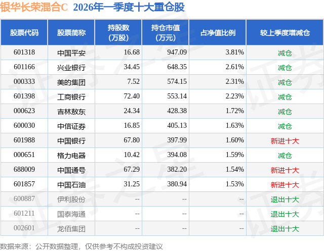 从基金规模来看,银华长荣混合C基金2026年一季度公布的基金规模为0.08亿元,较上一期规模1.21亿元变化了-1.12亿元,环比变化了-92.97%。该基金最新一期资产配置为:股票占净值比88.23%,无债券类资产,现金占净值比13.11%。从基金持仓来看,该基金当季前十大股票仓位达20.57%,第一大重仓股为中国平安(601318),持仓占比为3.81%。